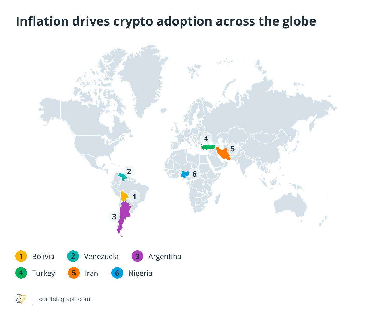Crypto outlet CoinTelegraph recently highlighted several case examples of countries adopting crypto, stablecoins and tokenized currencies in place of fiat currency, particularly in six countries: Bolivia, Venezuela, Argentina, Turkey, Iran, and Nigeria.