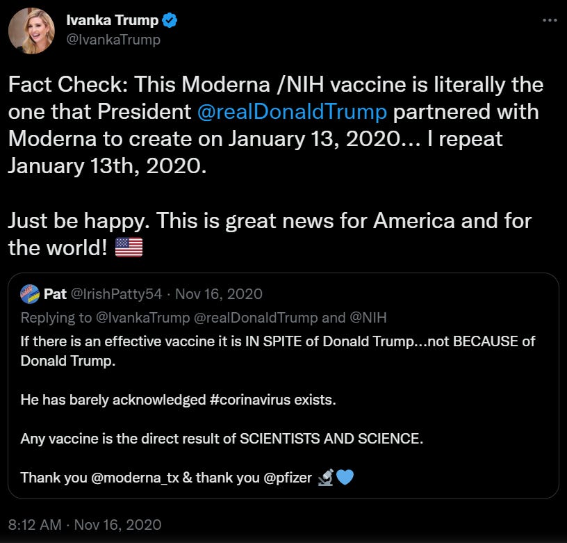 On November 16th, 2020, roughly a few weeks before the first round of Americans were the first to get vaccinated, Donald Trump’s daughter Ivanka – a senior advisor for her father, and was also the director of the Office of Economic Initiatives and Entrepreneurship – made a statement on Twitter following Moderna’s announcement of the efficacy results of their shot.