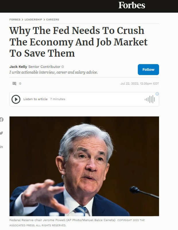 Citing a post by Jacobin, the headline reads: “To Fight Inflation, the Fed Is Declaring a War on Workers;” and Forbes reporting that “Why The Fed Needs To Crush The Economy And Job Market To Save Them.” Almost one year ago, on May 4th, Fed Chair Jerome Powell admitted that the goal was to crush workers and employers. He said, “[by reducing hiring demand], that would give us a chance to get inflation down, get wages down, and then get inflation down without having to slow the economy and have a recession and have unemployment rise materially.”