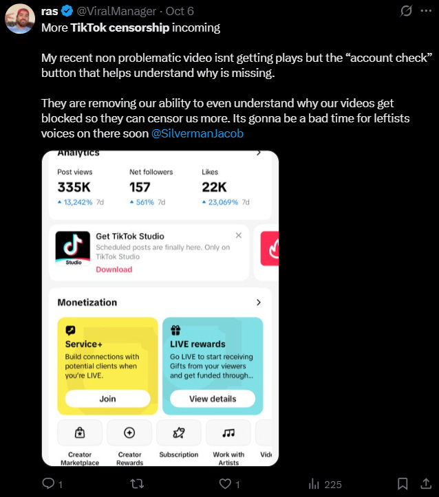 The TikTok deal is threefold: coverup for Israel; only promote whatever the current American administration wants us to see; and create a media blackout. That last point is overlooked. It’s not just about censoring what comes in, but what comes out. The U.S. is collapsing at breakneck speed, and those in charge don’t want the world to see the current state of affairs unfolding. Instead, all foreigners will know is what the approved Orwellian messaging is and will not understand just how dire the situation is, more than what the world already knows of our abominable, rogue, failed experiment.