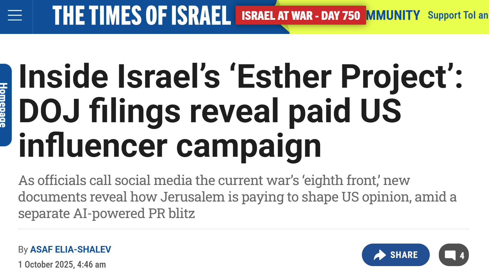 It’s a bit of a surprise that mainstream Jewish press is actually admitting that Israel is paying-off influencers and propagandists in such detail, but when all the vehicles to expose and criticize it are now censoring people, I guess then they can speak so boldly because they know there isn’t much you can do about it.