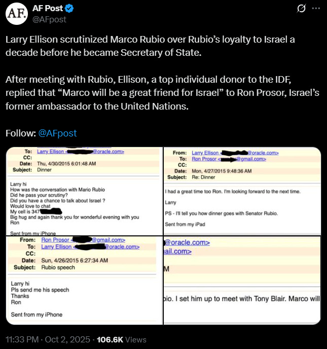 Truthout also noted: “Drop Site News reports that Ellison once vetted Secretary of State Marco Rubio for “fealty to Israel” with Ron Prosor, then-Israeli ambassador to the United Nations. Hacked emails show that Prosor updated Ellison in 2015 and 2016 on Israel’s actions at the United Nations and referred to a meeting where Ellison expressed “a wish to get more involved in Israel.””