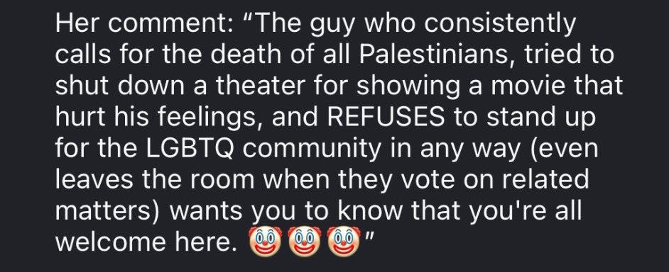 “The guy who consistently calls for the death of all Palestinians, tried to shut down a theater for showing a movie that hurt his feelings, and REFUSES to stand up for the LGBTQ community in any way (even leaves the room when they vote on related matters) wants you to know that you’re all welcome here,” followed by three clown emojis.