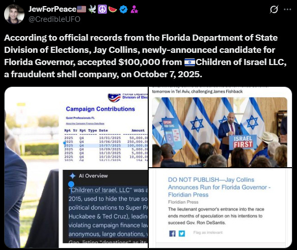 Lieutenant Governor Jay Collins recently announced plans to run for Florida Governor, and he too has made statements in recent weeks claiming that statements about ‘wanting to destroy Israel’ need to be suppressed.