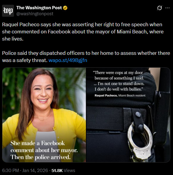 Recently, a Miami, Florida, woman, retired veteran Raquel Pacheco, was visited by police for a post she made on Facebook criticizing Miami Mayor Steven Meiner.
