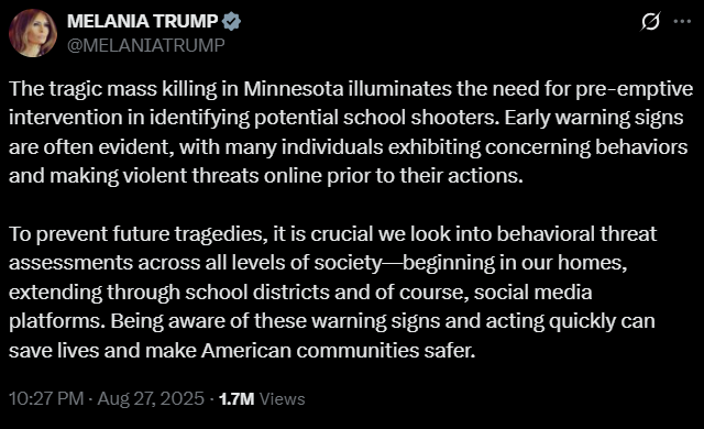 As referenced in Cohen’s remarks on Fox News, First Lady Melania Trump took to X to announce that she thinks preemptive criminal enforcement measures are needed in the wake of the Catholic school shooting.