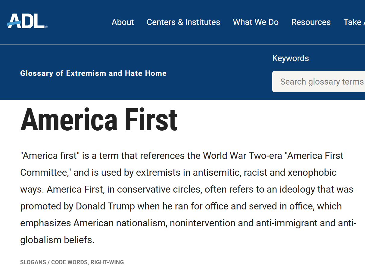 Recall earlier this month that the Jewish Anti-Defamation League (ADL) added the phrase “America First” to its glossary of “hate speech” and “extremism” as being antisemitic. Because, apparently, prioritizing your own country, national interests, culture and heritage, is evil.