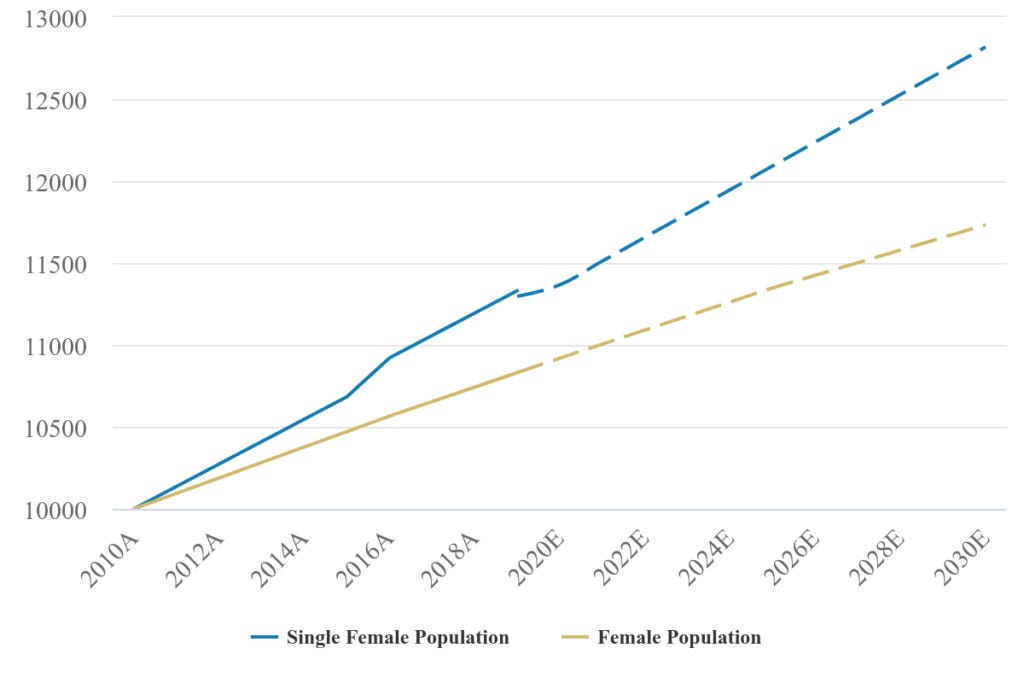 Morgan Stanley estimates that by 2030 45% of women between the ages of 25 to 44 will be single and childless.