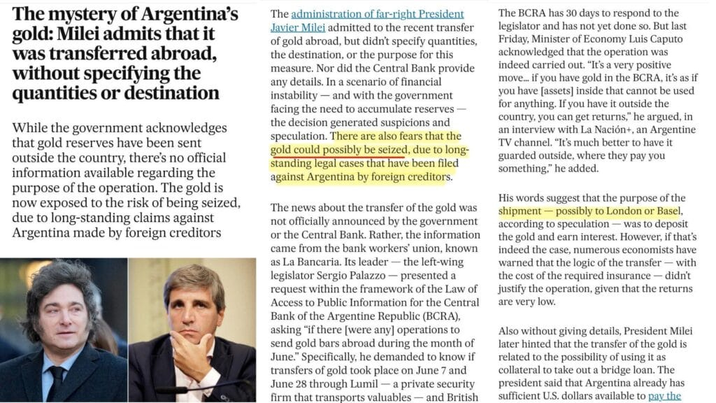 Take Milei, for example, someone alt- and right-leaning media propped up Milei as a Libertarian, as some sort of hero, especially when he “rebuked” the WEF for its terrible ideals. But after he took over as president two years ago and not long thereafter Milei gave a firebrand speech at the WEF, he met with BlackRock’s Fink to discuss investment opportunities and infrastructure. It did not take long at all, but Milei walked back most of his campaign promises and has already filled his cabinet with the same old “swamp creatures” as before. It’s business as usual. Not that long ago he admitted to secretly “transferring” Argentina’s sovereign gold reserves abroad, but did not specify the details (where, amount, why, legal rights, etc.).