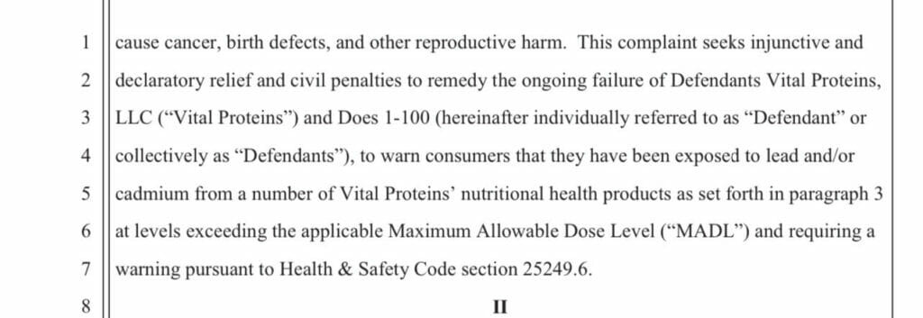 In 2018 the California-based Environmental Research Center Inc. filed a lawsuit against Vital Proteins LLC, where the organization said the Vital Proteins products contained high levels of cadmium and lead, which are known toxic heavy metals. Therefore, the Research Center sued the company for not adequately providing a warning label.