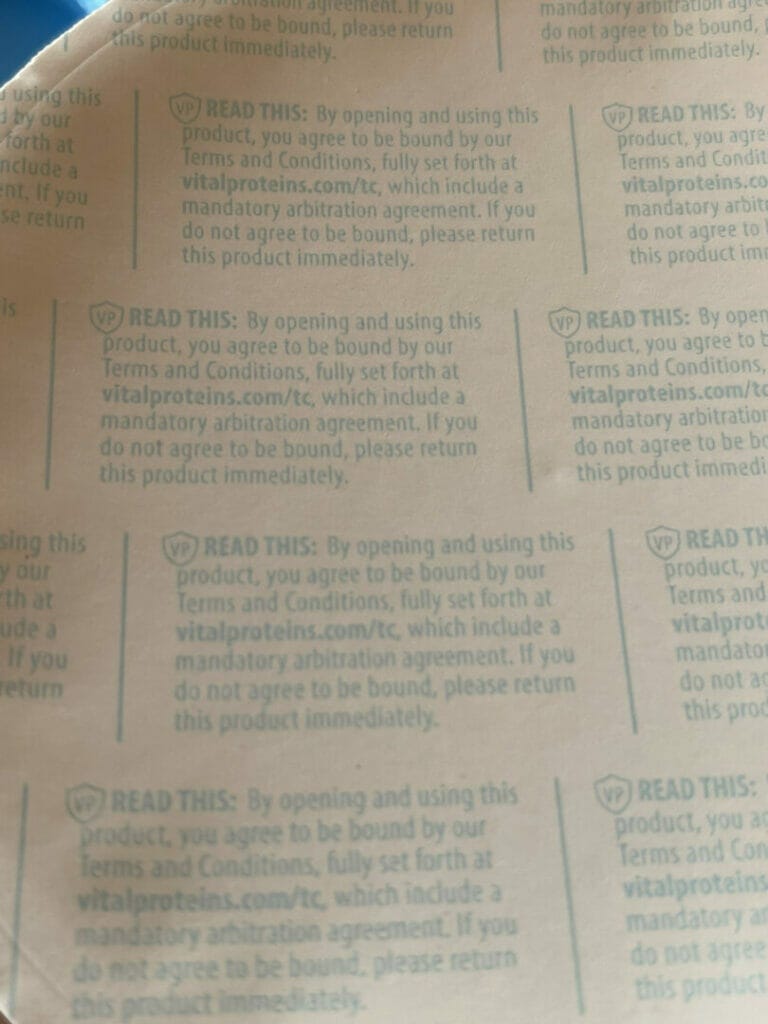 "By opening and using this product, you agree to be bound by our Terms and Conditions, fully set forth at vitalproteins.com/tc, which include a mandatory arbitration agreement."