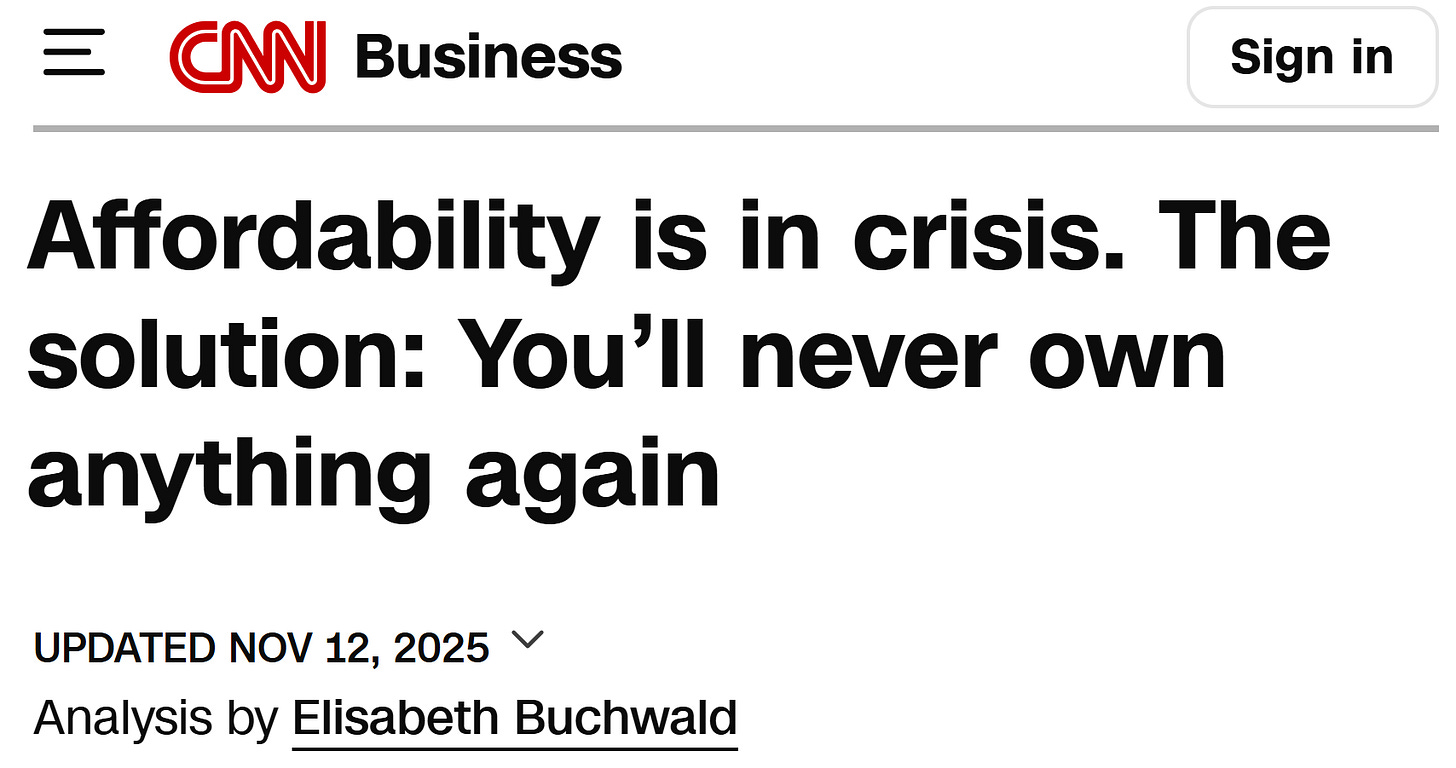 CNN is the latest transgressor with a headline that comes out and just says it: “Affordability is in crisis. The solution: You’ll never own anything again.”