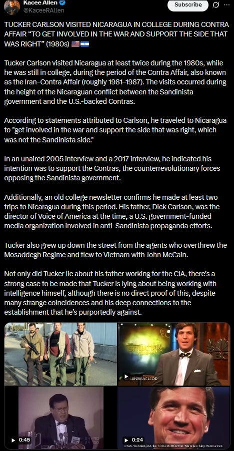 There is a lot more to the story so I suggest you read the rest of it, but it goes on to explain and expose Tucker’s fake populism act that he has put on for years, and continues to do so now, when he in no way relates to the common American, but is a so-called "nepo baby” with CIA ties, and in my opinion absolutely is CIA now. If you know anything at all about Operation Mockingbird, then you know that this is not a far-fetched question to ask.