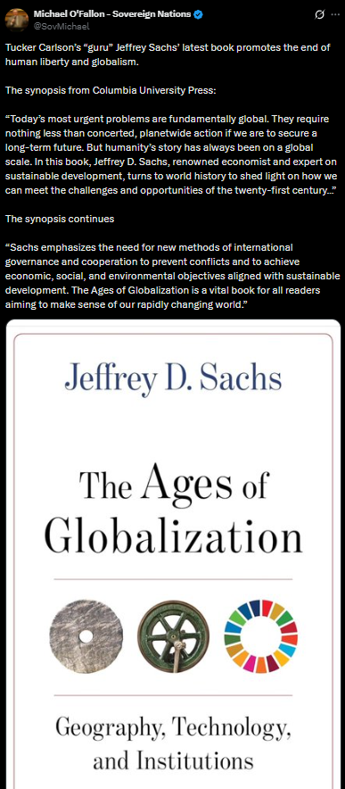 For example, on a number of occasions Carlson has promoted Jeffrey Sachs, a Jewish man who is director of the Center for Sustainable Development at Columbia University and president of the UN Sustainable Development Solutions Network, a SDG Advocate for UN Secretary-General António Guterres on the Sustainable Development Goals (SDGs).