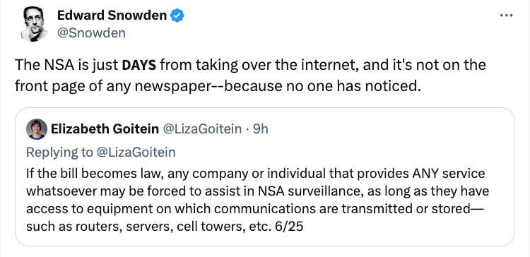 Edward Snowden, a former contractor for the NSA turned whistleblower, has warned that this move effectively allows the U.S. government to takeover the internet. He said in a post on X, the “NSA is just DAYS from taking over the internet,” but is not even getting the proper attention it needs. This was in response to Elizabeth Goitein, the co-director of the Liberty and National Security Program at the Brennan Center for Justice, who also warned that the NSA will now have immense powers to surveil Americans.