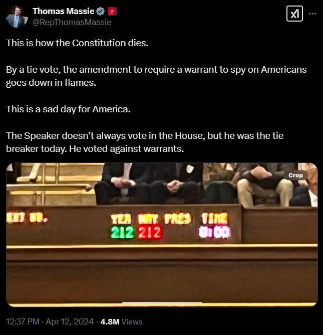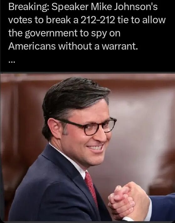 But before the final vote was taken, an amendment was proposed that would force the FBI to obtain a warrant to access these critical records and communications, but was deadlocked at 212-212, with Republican Speaker of the House Mike Johnson acting as the tiebreaker to shootdown the amendment.