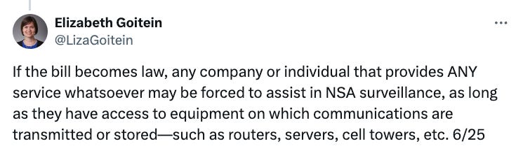 However, Goitein claims that through an “innocuous change” to the definition of “electronic communications surveillance provider” in the FISA 702 bill, the U.S. government could go far beyond its current scope and force nearly every company and individual that provides any internet-related service to assist with NSA surveillance.