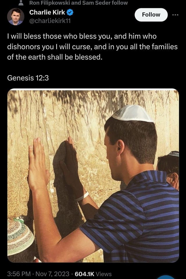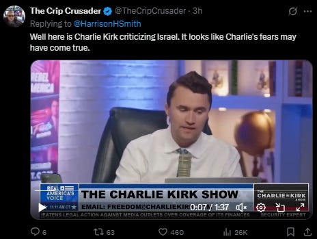 I never really watched Kirk that much outside of a handful of soundbites here and there, same for most of these alternative pundits that clearly are pushing this tribal and big-government messaging, including Kirk, but apparently the man was starting to relent his open support for Israel. He did some of this last year and especially this year as his audience of young conservatives are getting relentless about what Israel is doing and its heavy influence and control in the United States. Kirk, who was a staunch loyalist to Trump, started to divide from him on this issue.