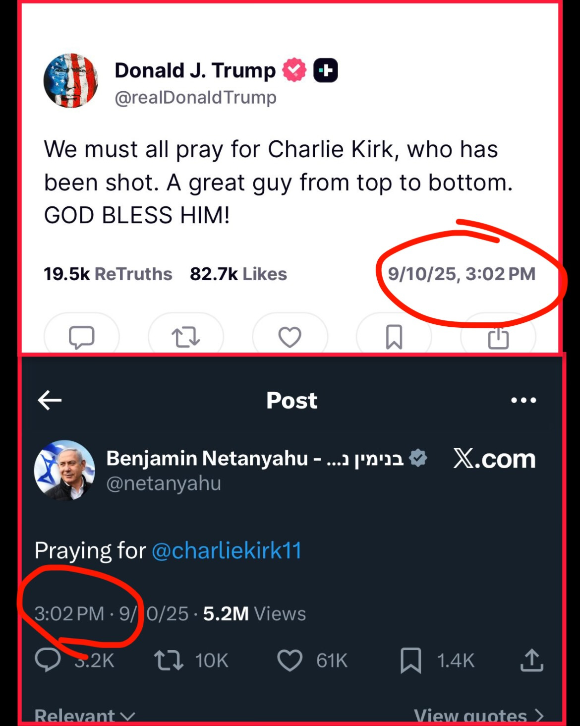 The timing of things is quite strange. Trump and Israeli Prime Minister Benjamin Netanyahu both posted their condolences online at the exact moment.