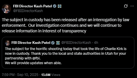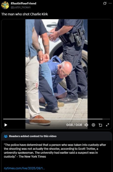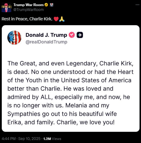Obviously this is a horrible and polarizing event that will traumatize and radicalize many. Yesterday was a somber day, not just because Kirk’s life was brutally taken, but because of the ramifications this will cause.