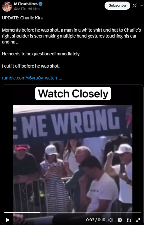 Then things get stranger yet when just moments before Kirk was killed, there was a man standing to the right of Kirk performing some strange hand signals, with some speculating that this man was giving the all-clear to take the shot. He was also recording at the same time as could be seen from different filming angles.