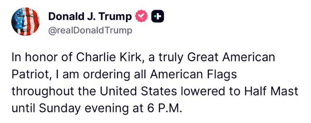 It was later confirmed by President Donald Trump that Charlie Kirk had died. He has ordered flags to fly at half-staff until Sunday.