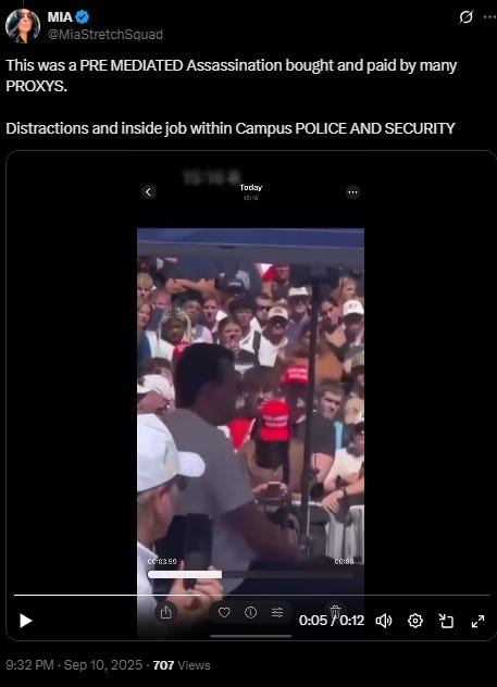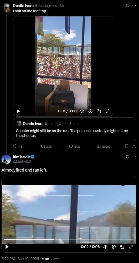 On the eve of the 24th anniversary of the 9/11 attacks, conservative and MAGA commentator and influencer Charlie Kirk was assassinated at a political event at Utah Valley University. One shot was fired and struck Kirk in the neck. Kirk’s body froze as he appeared to become paralyzed as blood gushed from this neck as he collapsed to the ground, as the crowd shrieked in terror and ran. He was debating mass-shootings with someone in the audience before he was fatally shot.