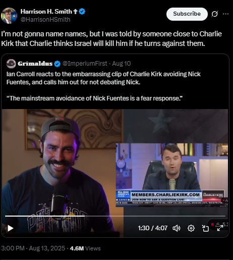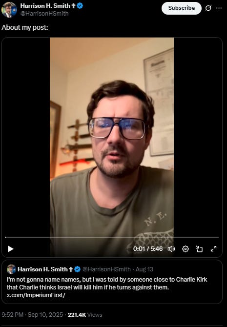 But here’s where things get really interesting. One month ago, Harrison H. Smith from Infowars said in a post that has now gone very viral that someone told him that if Charlie does not tow the line, then Israel will kill him.