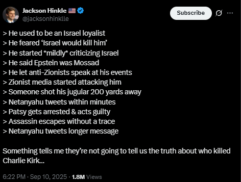 If the country was divided enough already before this… well, buckle-up, because this just poured gasoline on the fire. Those who are caught-up in the right vs. left paradigm have clearly chosen their sides. Those on the Left, many of them, are celebrating and have shown no remorse, calling for more gun reform. The Right has declared Kirk a martyr who died at the hands of a leftist lunatic who can’t handle facts and logic. But I will say that there are a lot of people (still the minority) who noticed some of the evidence I presented and are not buying the narrative, with a lot of people openly saying Mossad did this. Just this morning the live chat for Tim Pool’s show was filled with comments like this. More Americans are starting to notice the uncanny connections.