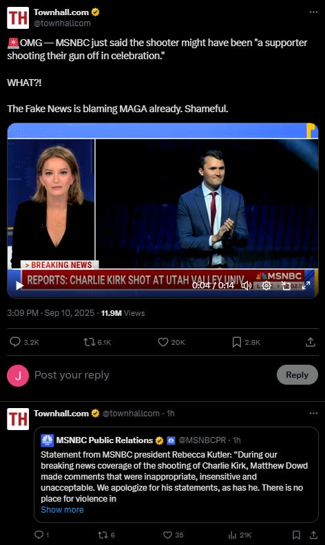Already, the political divide is in full effect. Not long after Kirk was shot, the evil beasts at MSNBC had the nerve to suggest it was one of Kirk’s who shot his gun in excitement. It was so bad MSNBC had to apologize.